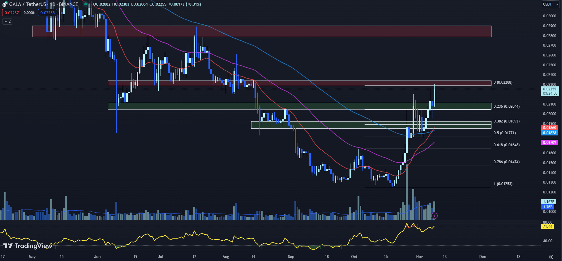 GALA 价格在 11 月 3 日从 100 日均线反弹后继续上行。GALA 目前正试图突破其直接阻力位,今天早些时候创下了数月新高 0.02303 美元。