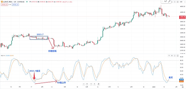 那现在也是一样 kd在20附近也是有金叉 或者我们观察一下当时在2023年7月这个位置也是有一些上涨的高点 不过最终是在这个位置崩盘的时候 就是kd指标在背离 我们可以观察一下 价格在创新低 然后下方的kd之前的数值是和后面的数值在呈现一个上升的走势