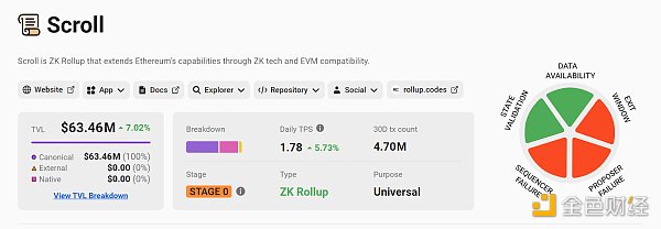 据 L2Beat 称,Scroll 目前是以太坊扩容场景中第 17 大 L2,其 TVL 为 6350 万美元,使其成为当今生产中最活跃的 zkEVM 之一。 这项活动大部分源于 Scroll 的早期 DeFi 场景,目前分布在约 50 个应用程序中。