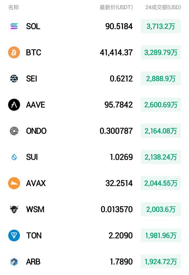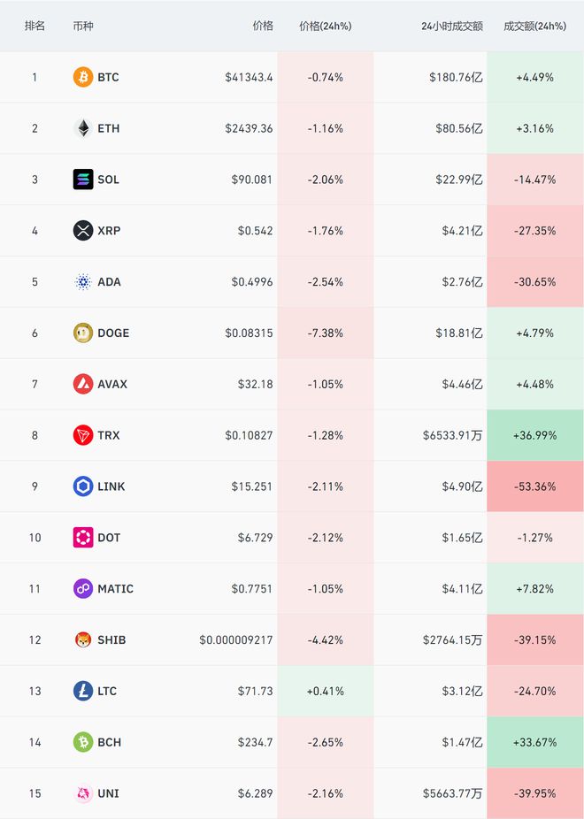 比特币(BTC)过去24h下跌0.24%,最高报41870美元,最低报41266美元,波动率增加至1.46%。以太坊(ETH)过去24h下跌1.13%,走势弱于BTC,最高报2481美元,最低报2435美元,波动率1.88%。