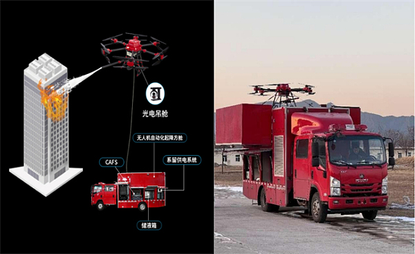 除了在通信、监视和侦察、联合多域作战等军工领域的应用,基于军用技术及成熟的工程化能力,「卓翼智能」实现在应急安全保障领域的产品降维打击。以高层灭火为例,高喷车灭火往往受到高度的限制,最高可喷射70米,但「卓翼智能」的车载无人机,可以带着水管快速升到高空,最高可达到150米。目前,已经上市的车载无人机最大负载量为75公斤,今年将推出120公斤级别负载量的产品。而最大载荷150公斤、有效作业高度为200米的车载无人机也已完成原理样机验证。