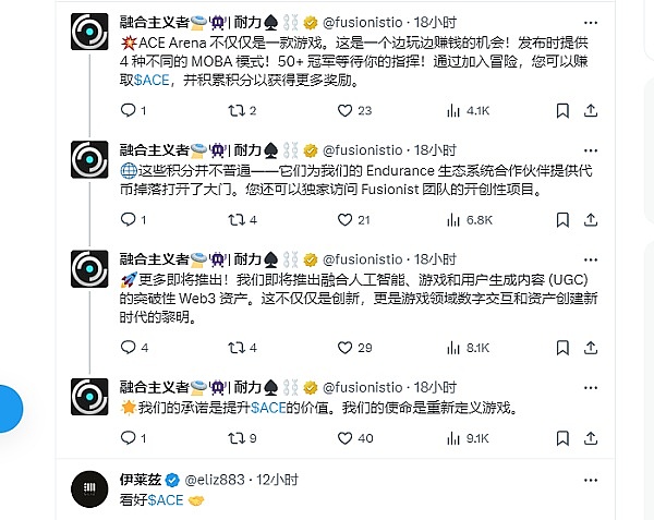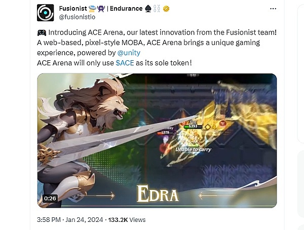 最近官推发布的动态来看要推出新的游戏了,ACE Arena ! 是 Fusionist 团队的最新创新!ACE Arena 是一款基于网络的像素风格 MOBA,带来独特的游戏体验,并且 ACE Arena将仅使用$ACE作为其唯一代币!