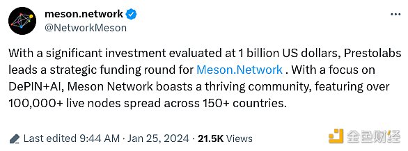 在同一时间,Meson Network官方宣布完成最新一轮战略融资,估值达到10 亿美元,跻身独角兽行列。