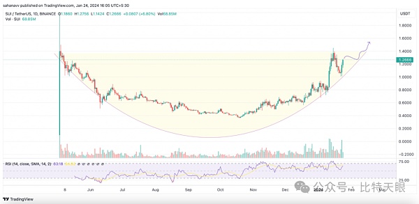 如上所述,价格非常接近实现抛物线式复苏,以收复颈线失去的水平。因此,价格预计将维持上涨盘整并最终达到之前的高点1.44美元。RSI继续保持看涨势头,这表明多头的主导地位日益增强。因此,随着交易量的增加和购买压力的增加,SUI价格预计将保持上涨趋势,并在未来随时触及1.5美元。