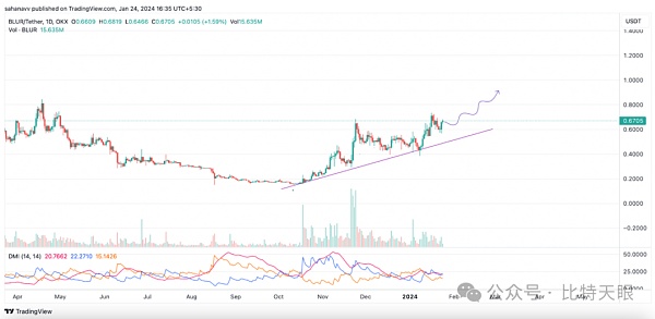 Blur价格从看跌盘整中开始上涨,但似乎没有带来所需的动力。上升盘整表明,随着价格维持较高的高点和低点,多头正在积聚力量。如此一来,维持上涨趋势的可能性可能会持续很长一段时间。