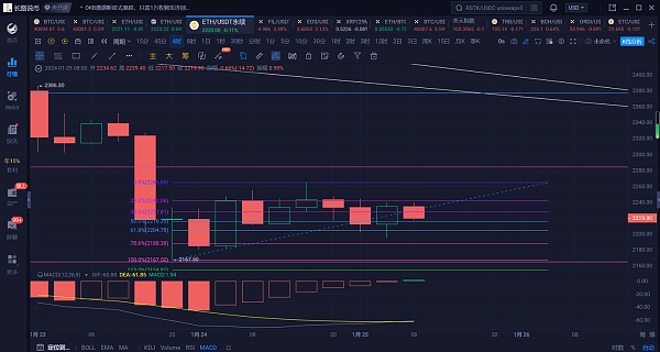 以太坊上个交易日白盘整体处于震荡反弹中,晚间最高涨至2265一线回踩,今天凌晨最低跌至2196附近获得支撑反弹,现行情位于2230附近震荡。