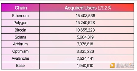 与此同时,比特币在2023年获得了1070万的用户。其他链的增长相对较少,如下所示: