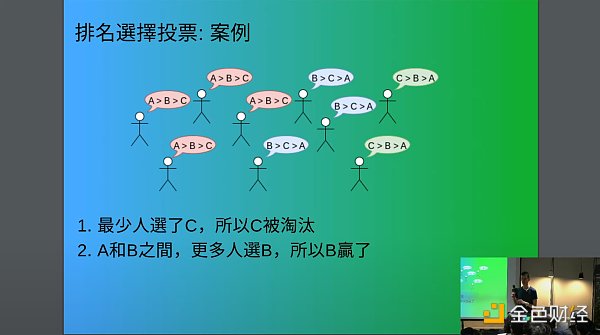 谈到目前传统投票系统的局限性和缺点,Vitalik 抛出一个基本问题:为什么仅仅投票给 A 或 B 不够好?他用一个简单的例子来说明这一点,其中九名选民分别支持不同的候选人,A 得到四票,B 得到三票,C 得到两票。在这种情况下,虽然 A 看似获胜,但 A 并不是最受大众欢迎的选项。
