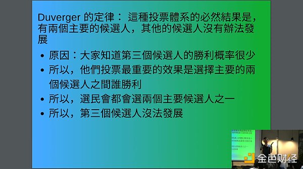 为了更清楚地说明,Vitalik 引用了“Duverger 定律(杜瓦杰法则)”,解释为何这种简单的投票系统往往导致仅有两个主要党派的局面。他举例说,像是在美国,这种现象非常明显,投票系统往往演变成两大党之间的竞争。
