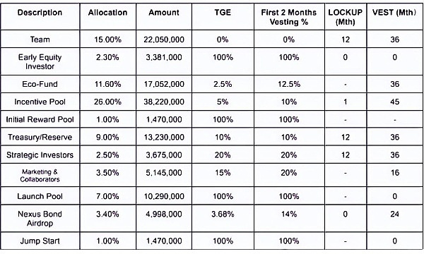 白皮书中的代币分配如下:团队和投资者分配总量约40%。当前流通量为21,969,520枚,其中10,290,000枚由币安Launch Pool分发,早期股权投资者持有3,381,000枚代币,占当前流通量的15.38%。