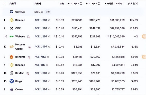 ACE的主要交易场所为币安(47.48%),其次是OK(13.94%)与Bithumb(5.93%)。