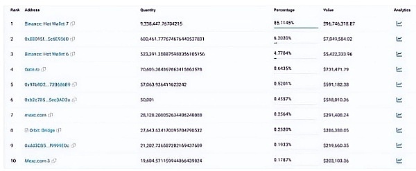 ACE代币主要分布在BSC链与Endurance主网上,BscScan当前可追踪代币数为10,971,626枚,其中币安地址占比约90%,持币第二大地址0x880持有约6.2%的代币。
