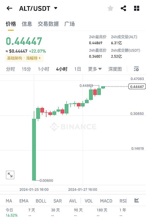 今天ALT价格突破新高,涨幅超过22%,当前价格0.44美元。ALT在1月25日空投上线,一部分早期AltLayer用户,收益丰厚。