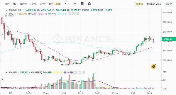 在这一轮周期中,BTC价格起伏波动,出现本轮最低点15476美元,到现在42000美元。