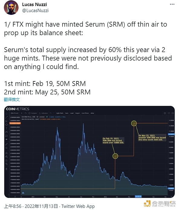 11月13日消息,据加密安全研究员Lucas Nuzzi发推表示,FTX可能凭空铸造了 Serum(SRM)以支撑其资产负债表,今年SRM的总供应量通过2个大型铸币厂增加了 60%。根据目前能找到的任何东西,这些以前都没有披露过。第一次铸造2月19日5000万SRM,第二次铸造5月25日5000万SRM。