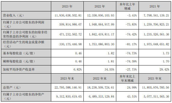 中国网财经4月7日讯(记者 刘小菲)多氟多日前发布2023年年报。报告期内公司实现营业收入119.37亿元,同比下滑3.41%;归属于上市公司股东的净利润5.1亿元,同比下滑73.83%。