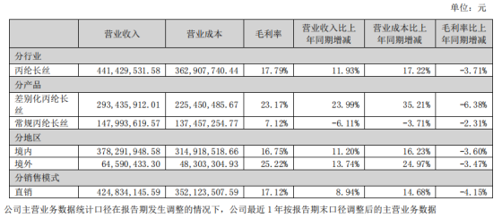 资料显示,蒙泰高新主要从事聚丙烯纤维的研发、生产和销售,公司收入则来自于丙纶长丝、锦纶纤维等产品。在年报中,蒙泰高新称,根据中国化学纤维工业协会的统计,公司近6年在国内丙纶长丝行业中的产量、市场占有率均排名第1。