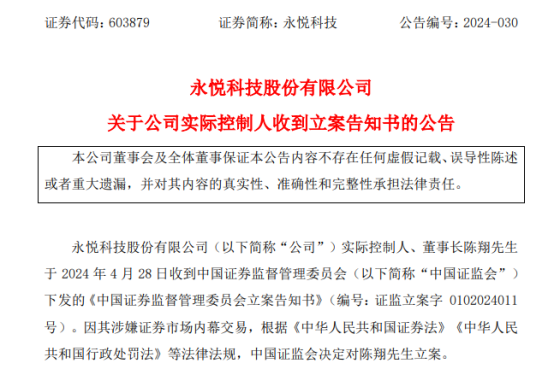 日前,永悦科技公告称,公司实际控制人、董事长陈翔于2024年4月28日收到证监会下发的《中国证券监督管理委员会立案告知书》(编号:证监立案字0102024011号)。因其涉嫌证券市场内幕交易,根据相关法律法规,证监会决定对陈翔立案。