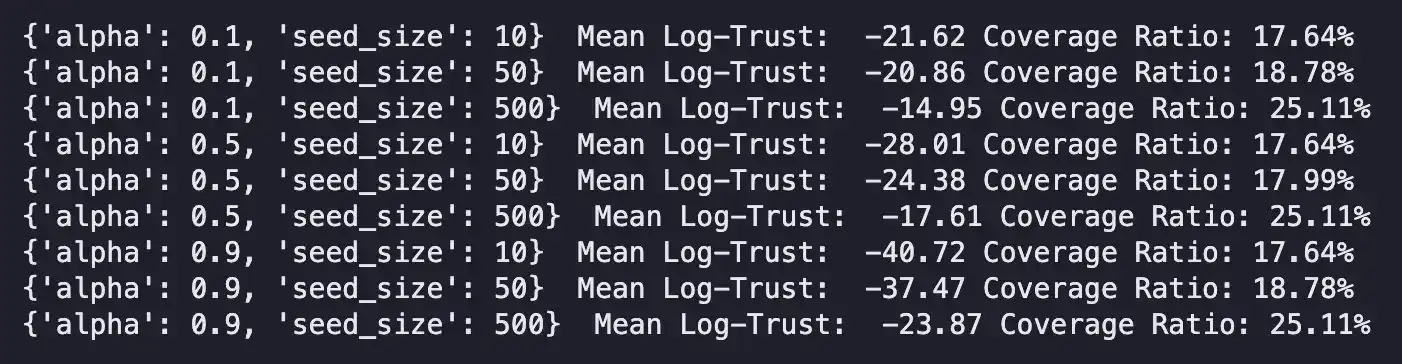 还记得前面公式中的常数「c」吗?让我们对不同的 c 值(我称之为 alpha)和不同的预信任种子大小进行网格搜索,看看哪个能给我们最对数正态的信任分数和最高的覆盖率: