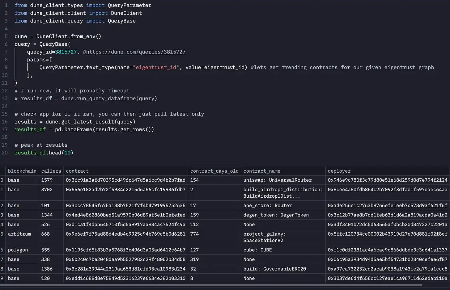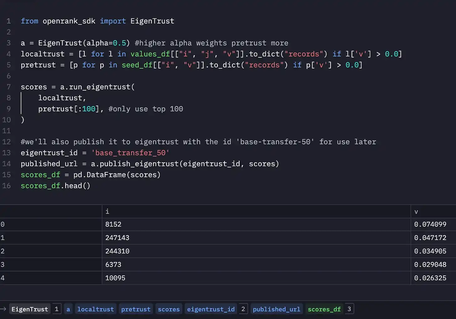在确认输入数据的大小和连接是合理的之后,我们可以运行并保存我们的 Eigentrust 图。我将我的图保存为 id「base_transfer_50」——你可以看到下面只需 10 行代码即可训练图。可以将 OpenRank SDK 视为加密图模型的 scikit-learn。