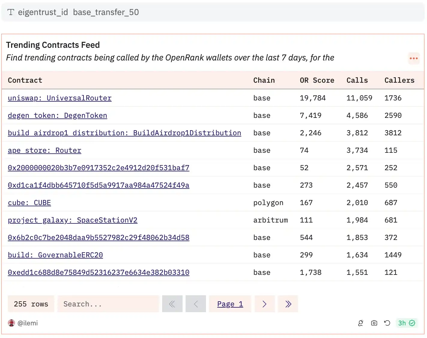 从这里,我们可以将值插入到在 Dune 的仪表板开始时链接的订阅查询中,以获得/base 频道中受信用户的合约互动流。这种主观的推荐输出帮助我们更好地将之前的通用指标与我们对推荐输出质量的预期直觉联系起来。