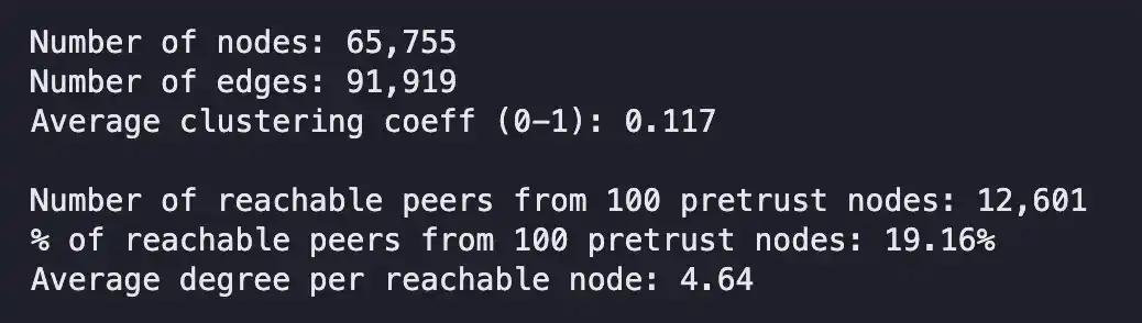 现在我们有了预信任节点和本地信任图,来看一些总结统计数据。/base 频道中有 65,755 名用户将代币转移给了该频道中的其他人,从我们的预信任节点可以遍历 19% 的图(即连接的节点)。这个百分比可能会根据图的本地信任数据的 Sybil 程度高低而有所不同。代币转移可能是高信号,但也可能是刷单,因此图的大部分是未连接的也不令人惊讶。