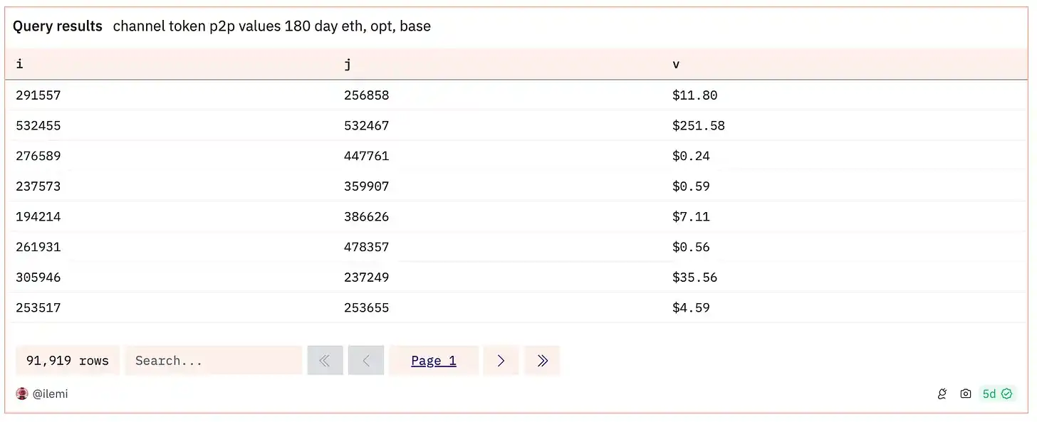 第二个查询是用于跟踪节点之间的链上互动,使用/base 频道中用户的链接地址。因为订阅流将推荐链上操作,所以我想确保选择一个基于链上互动量的互动图。使用节点之间转移的美元价值是一个很好的通用代理——我跟踪了在 Optimism、Base 和以太坊主网上的稳定币和 ETH 转移。