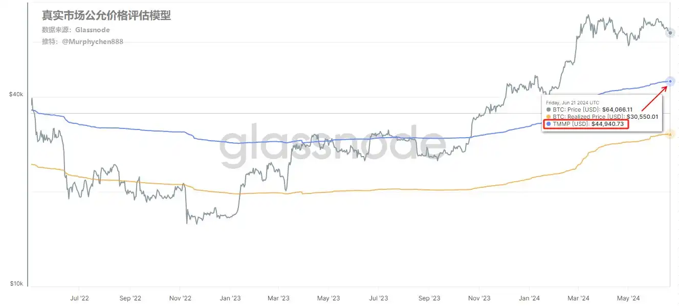 截止到 6 月 21 日,TMMP 模型评估的「真实市场公允价格」是 44,940 美元。也就是说,即使发生类似 5.19 级别的黑天鹅事件,BTC 价格回撤的极限值也将在$44,900 左右。这个价格和前文中用 STH-MVRV 评估出的极限值$43,129 比较接近,因此我认为这是一个值得参考的数字。
