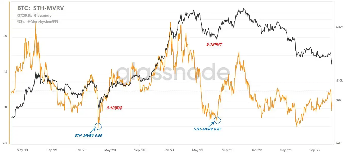 众所周知,在上一轮周期中出现过 2 个令人生畏的黑天鹅事件,也引发了 BTC 价格的暴跌。通过下图我们可以看到,3.12 事件发生时,STH-MVRV 最低到了 0.59;5.19 事件发生时,STH-MVRV 最低到了 0.67。意味着 3.12 时 STH(短期持有者)平均浮亏 41%,5.19 时 STH(短期持有者)平均浮亏 33%,可以看出当时的市场是有多么的惨烈。