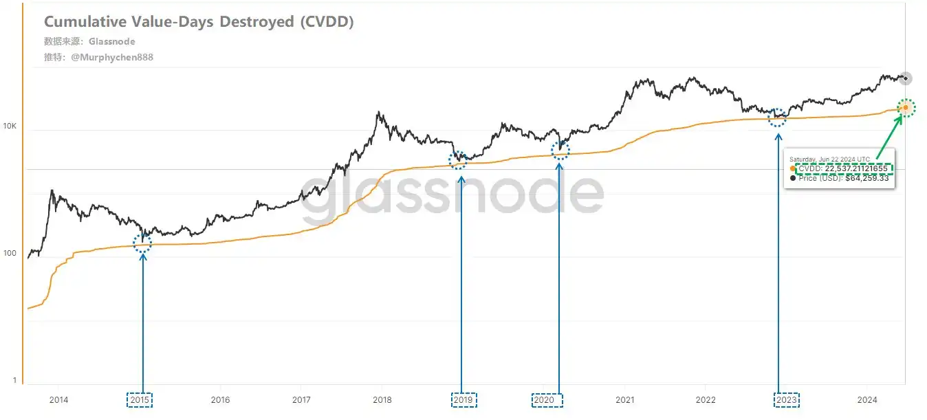 Coin Days Destroyed (CDD):当比特币被花费时,其持有的 Coin Days 被销毁。即 Coin Days Destroyed 是所有被花费的比特币的 Coin Days 的总和。