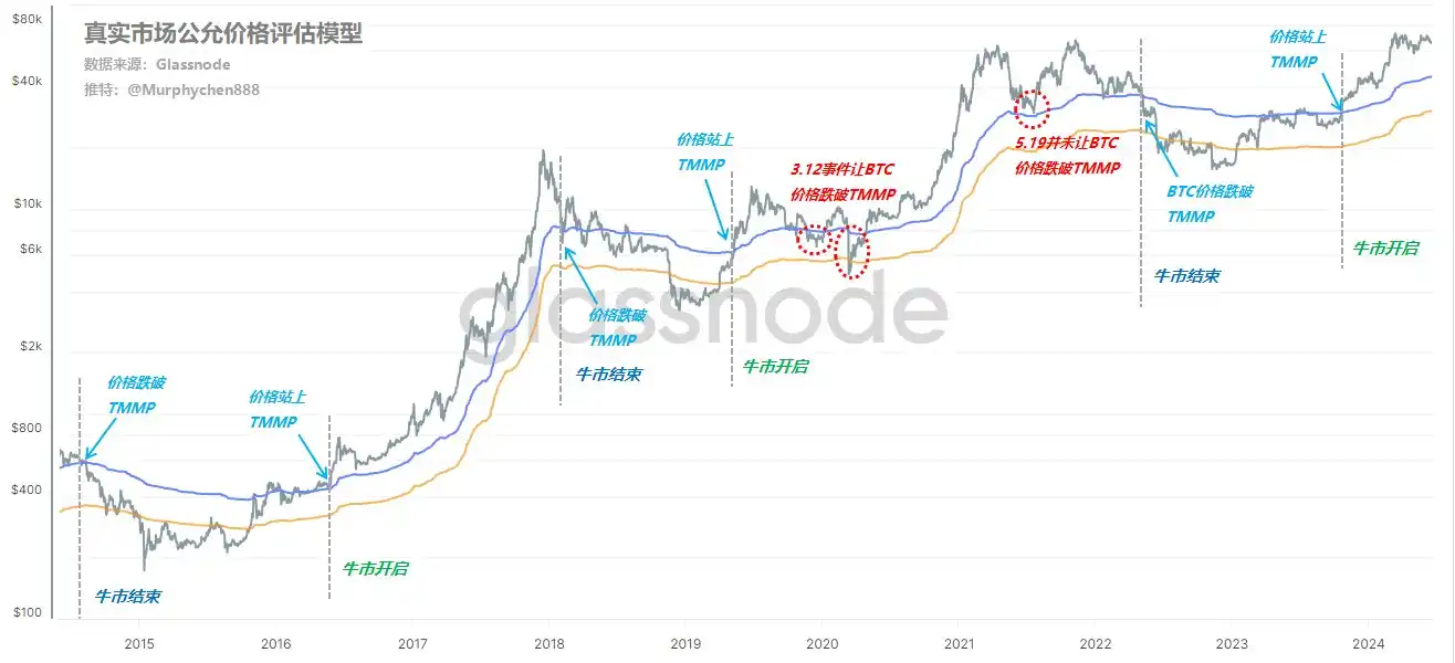 如上图所示,蓝线就是 TMMP,灰线是 BTC 价格;每当 BTC 价格站上蓝线意味市场已经走出熊市,进入牛市周期。尽管在此之前会有假突破,但最终形成有效突破后,BTC 的价格几乎不会再低于 TMMP,即便在 5.19 黑天鹅事件发生时也是如此。但 3.12 是唯一的特例,它让 BTC 在进入牛市周期后的价格又再次低于 TMMP。