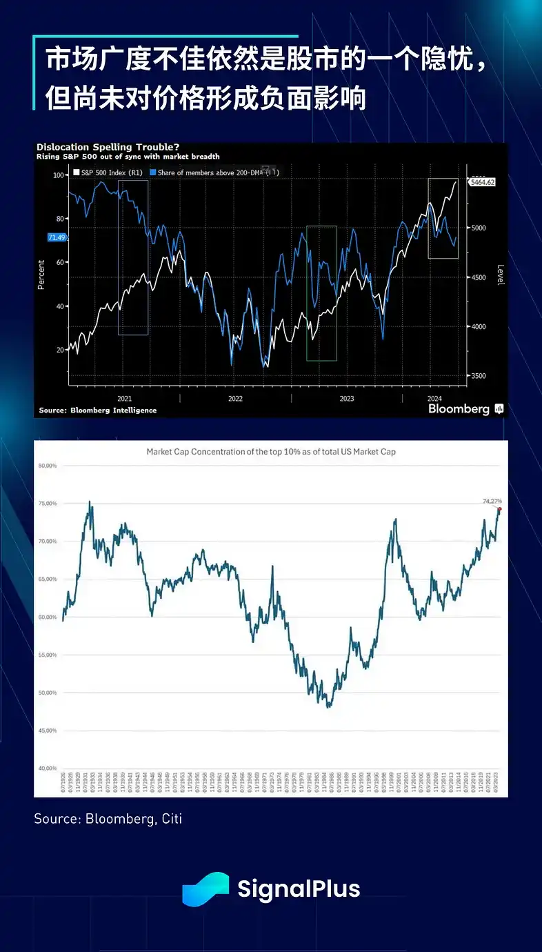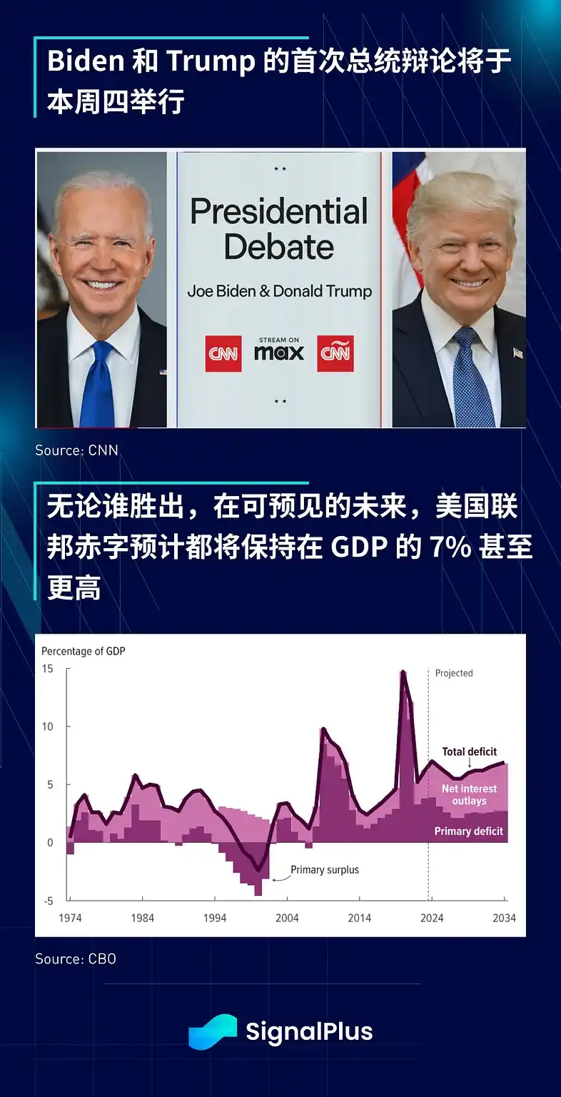 随着仲夏临近,股市继续攀登忧虑之墙,市场的注意力将逐渐转向政治。周四的美国大选辩论提早登场,在法院裁决后,市场赔率已大幅偏向前总统 Trump,不过两位候选人都很可能继续推行不可持续的美国财政扩张政策,美国国会预算办公室(CBO)将 2024 年赤字提高到 GDP 的 7% 以上,并预计在可预见的未来都将保持在这一水平之上。