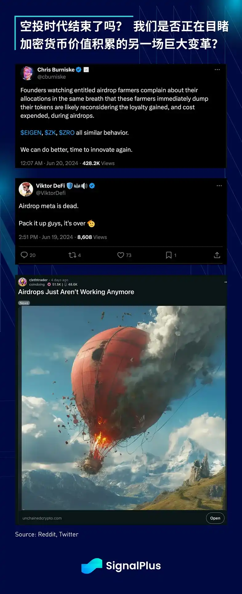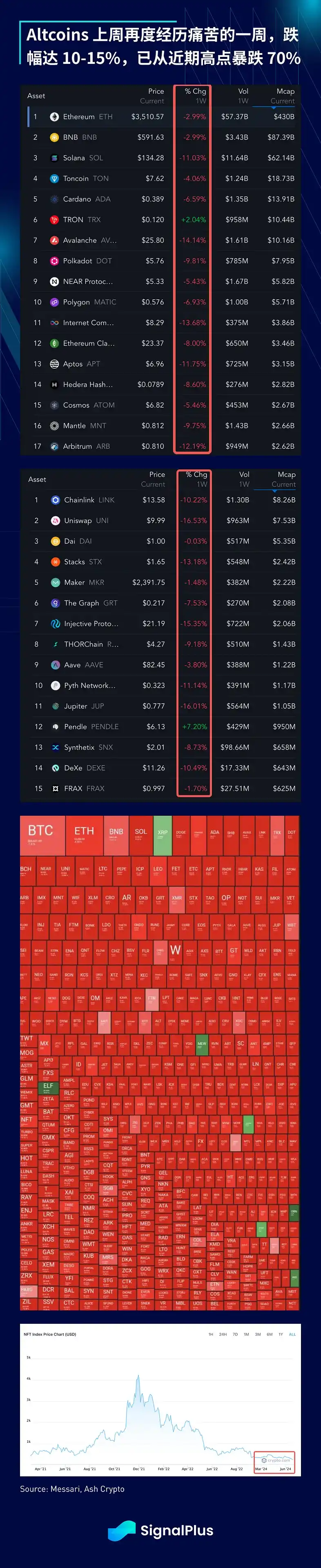 本周期的一个不同之处,就是主要币种的反弹不太可能导致 Altcoins/NFT 的正面溢出效应,但上周加密货币原生用户受到了尤其严重的打击,原因是知名 DeFi 项目发生各种空投「阴谋」,许多原生用户在过去一年里一直努力耕耘空投,作为新的「Alpha」,但 ZKsync、Layer Zero、Eigenlayer 等项目的实际奖励明显低于预期,动摇了用户的信心,甚至引发了许多关于空投「时代」已经结束的讨论。随着 NFT、Memecoin 和以太坊 L1 手续费不断下跌,原生生态系统是否会迎来另一场巨大变革?确实是相当有趣的一年。