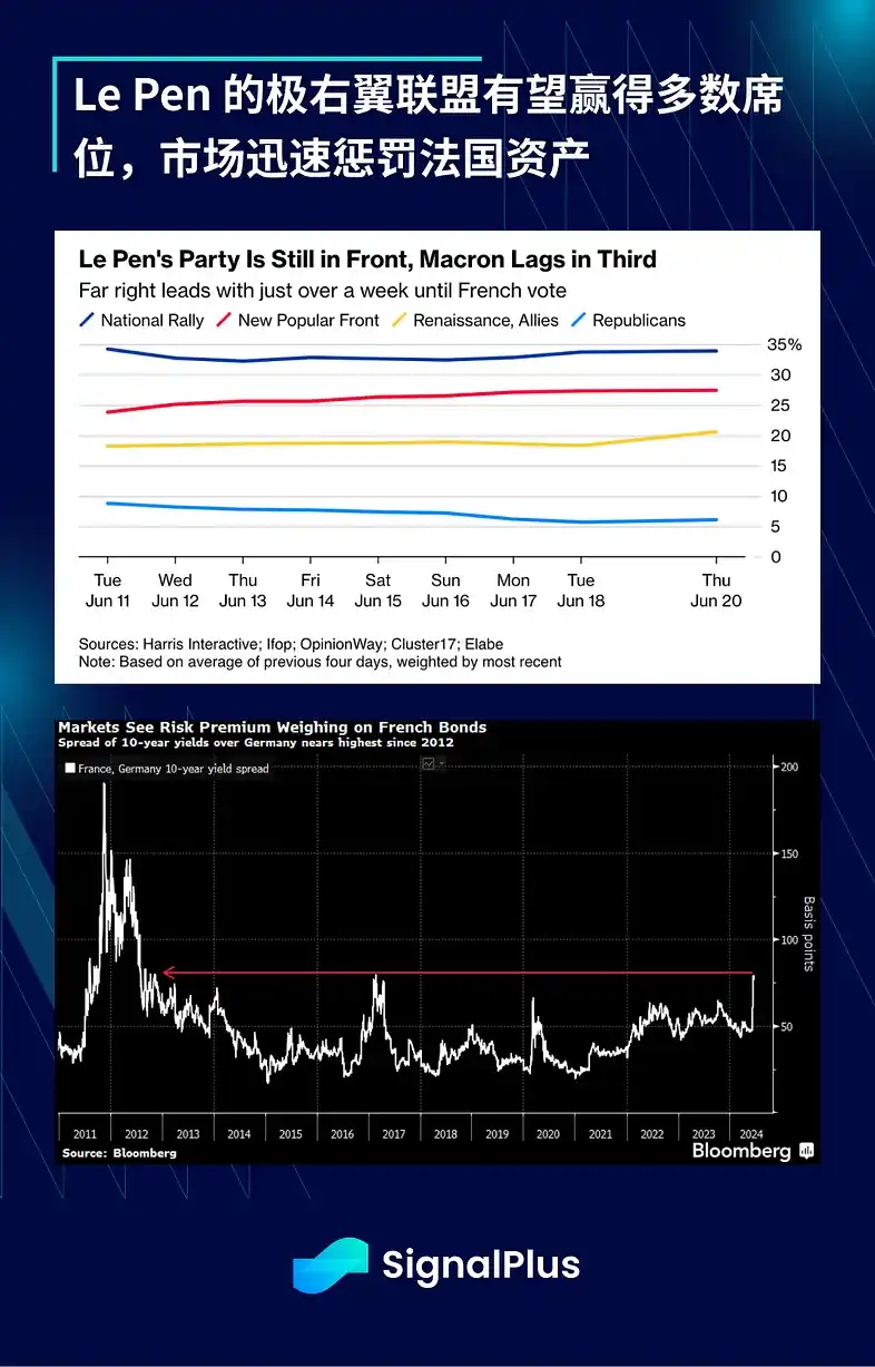 法国选举将于 6 月 29/30 日开始,第二轮将于 7 月 6/7 日举行。Le Pen 的 National Rally 仍稳居领先地位,极右翼联盟有望获得绝对多数,市场已经先对法国资产投下不信任票,法国国债相对德国国债的利差扩大至 2012 年以来的最高水平。