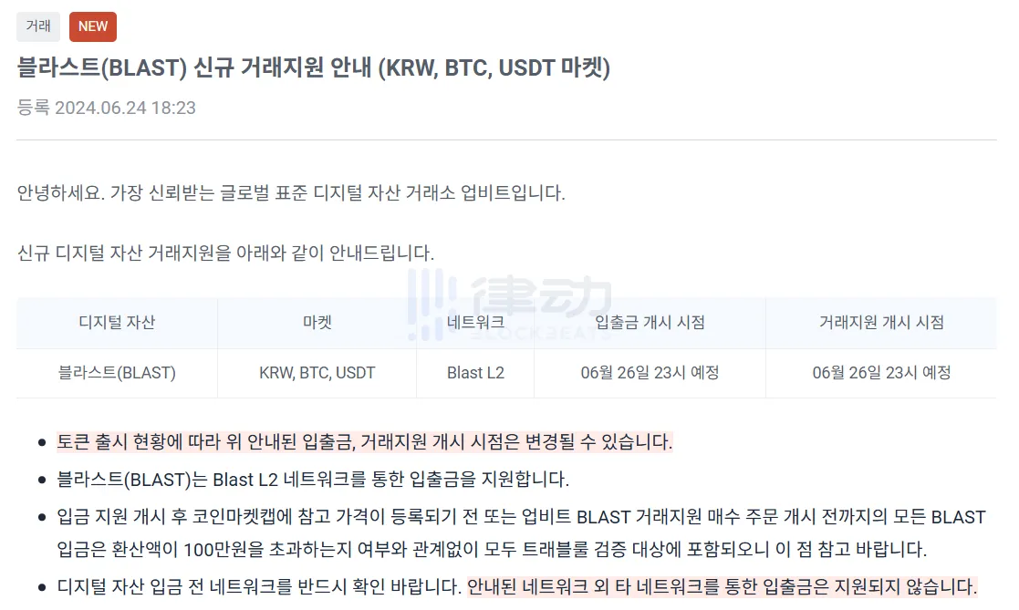 BlockBeats 消息,6 月 24 日,据官方消息,韩国加密交易平台 Upbit 将上线 Blast(BLAST),支持 KRW、BTC 以及 USDT 交易对。