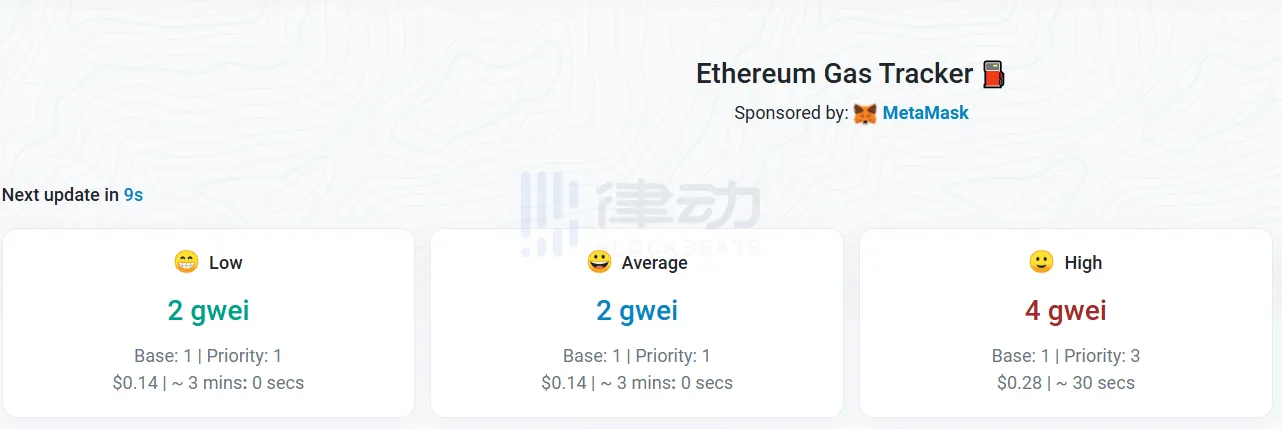 以太坊网络Gas费降至2 gwei