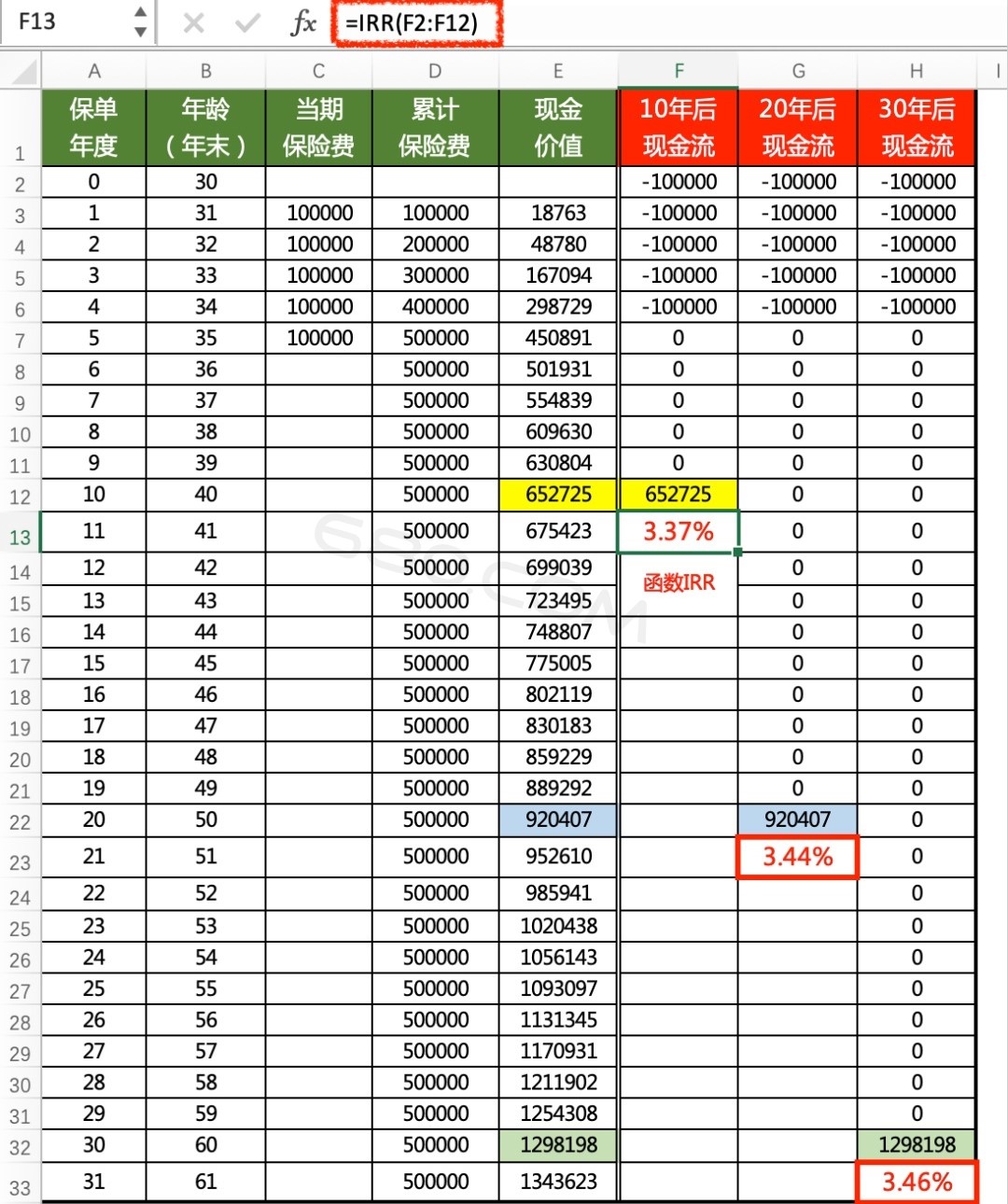 我先用Excel计算一遍,10年的IRR是3.37%、20年是3.44%、30年是3.46%。