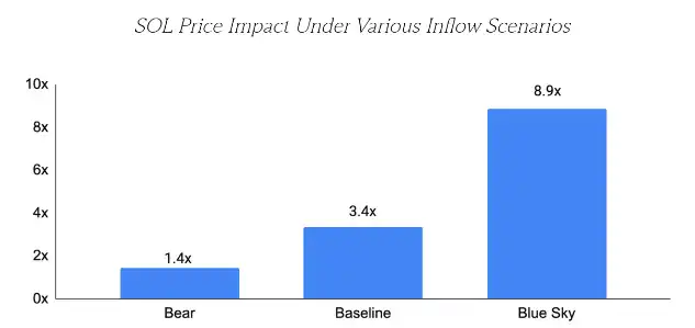 在熊市和基本情况下,现货 Solana ETF 将占据吸引比特币 ETF 资金流量的 2% 和 5%,这将分别引发 Solana 价格上涨 1.4 倍和 3.4 倍。