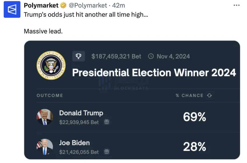 BlockBeats 消息,6 月 28 日,预测市场 Polymarket 上特朗普的胜率再创历史新高,领先优势巨大。而拜登退出的可能性继续飙升。