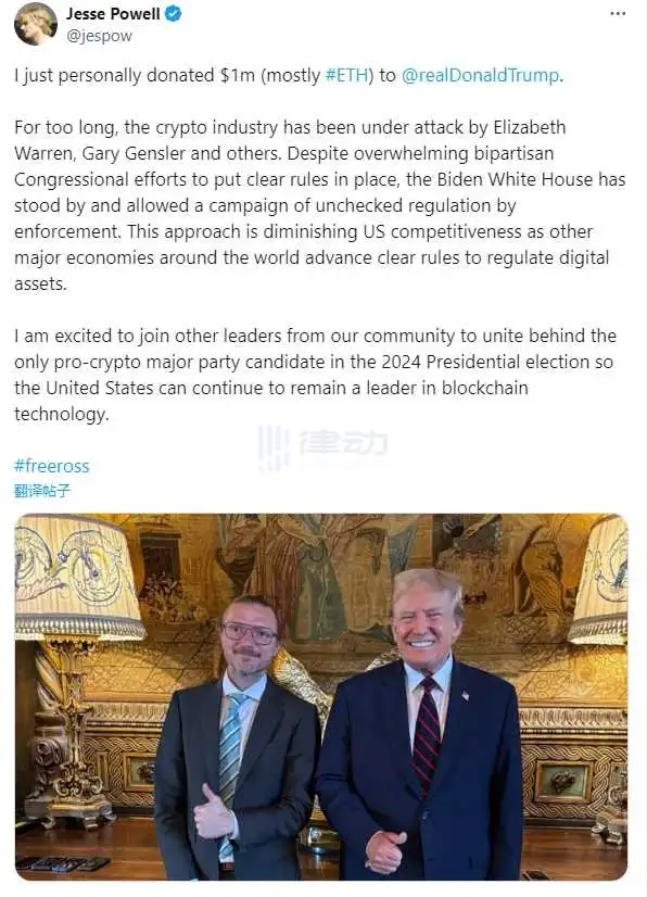 Powell 推文中称,「很高兴能与我们社区的其他领导人一起团结在 2024 年总统大选中唯一的亲加密货币主要政党候选人背后,以便美国能够继续保持区块链技术的领先地位。」