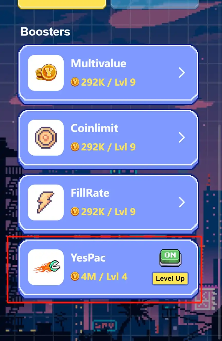 玩法也是差不多点点点,稍微升级了下变划划划。省心的是挂机就行了,在 Build 栏里面升级 YesPac 会自动帮我们吃金币。