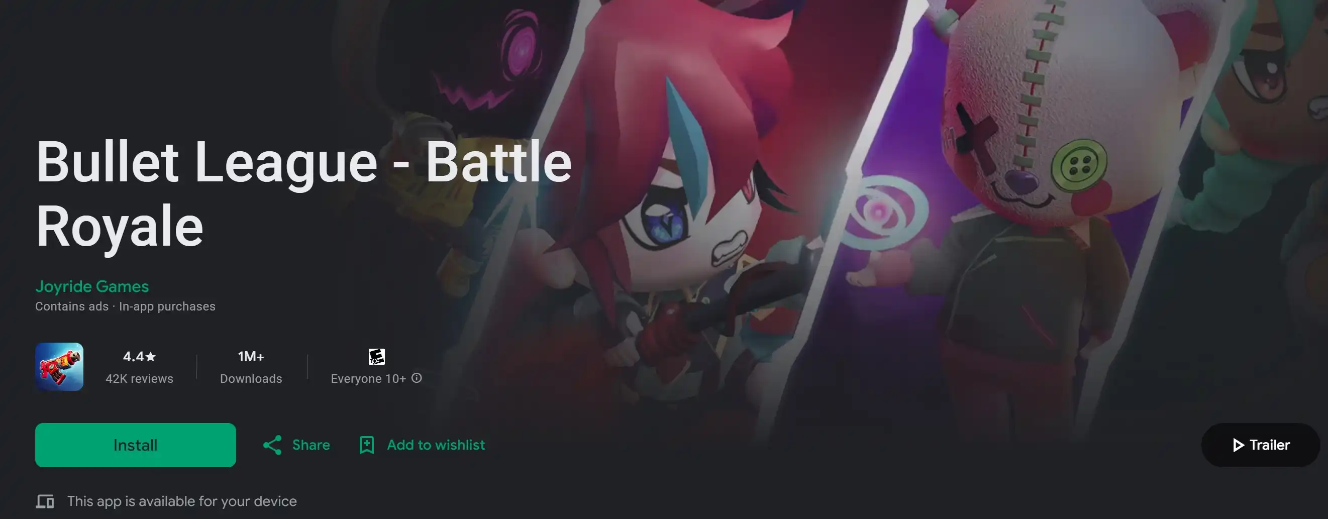 另外就是他们背后的公司 @onjoyride 在 2023 年 9 月的时候宣布收购了一款叫 Bullet League @getbulletleague 的吃鸡手游,这款游戏在 Google Play 上也是百万级别的下载量。收购完以后 Bullet League 整合了 Super Champs 游戏生态的一些元素进去(Super Champs 还有一款网球游戏 Racket Rampage,但是小编对网球游戏不咋感冒就没玩)。
