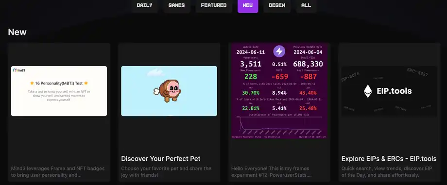 Farcaster 今年的巨大增长与二月推出的 Frames 功能密切相关。Frames 是内嵌在 Warpcast 中的迷你小程序,用户无需离开 Warpcast 就能进行更多样化的互动,如铸造 NFT、内容订阅、玩小游戏和领取代币等。