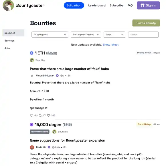 类似的,也可以发布能够提供的服务和价格。用户可以需要通过 Farcaster 账户登录,在 BountyCaster 网站查看已发布的 Bounty,可提供的服务,甚至工作机会。