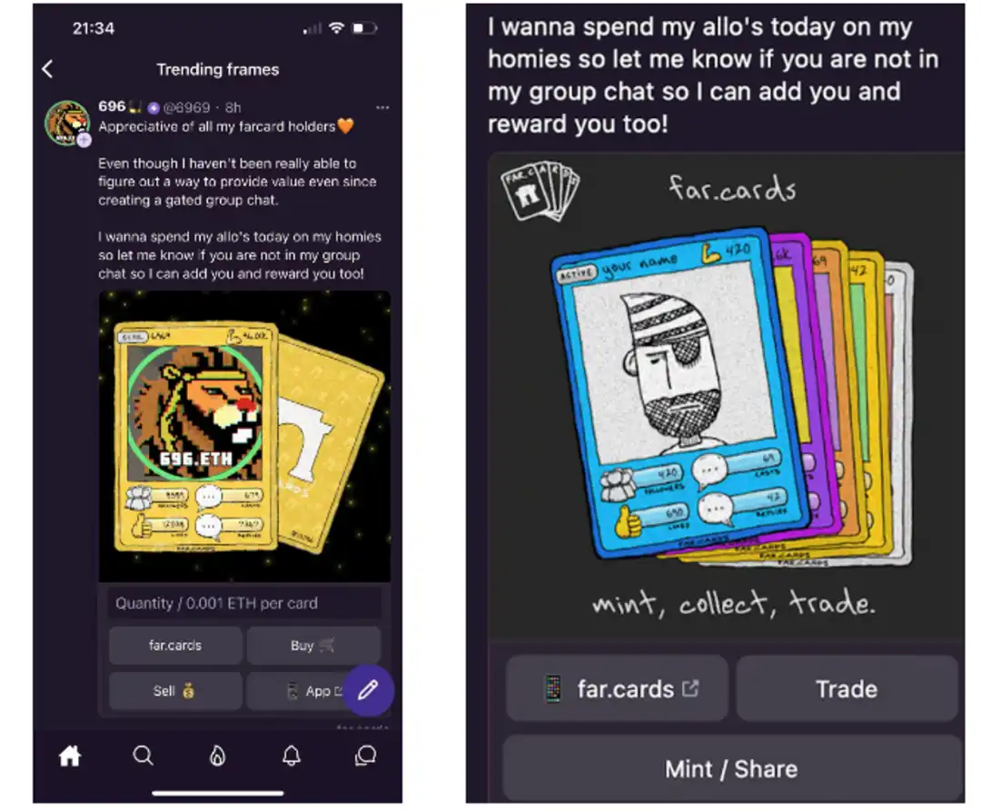 如下图所示,far.cards 的应用可以以 Frame 的形式发布在推文中,看到推文的用户能够直接通过该 Frame 购买其卡牌,无需离开 Warpcast 客户端即可完成。