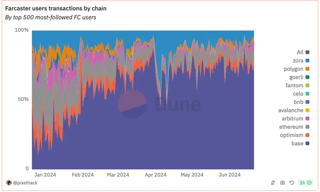 从另一个角度来看,Farcaster 上粉丝最多的前 500 名用户中,超过 70% 的链上交互发生在 Base 链上。