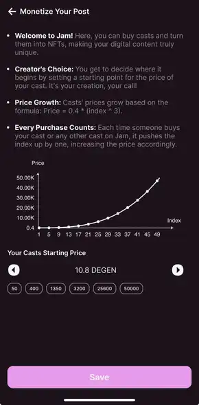 Jam 是一款基于 Farcaster 的创作者经济平台,可以将用户在 Warpcast 上的每一条推文转化成为类似 Friend.tech Key 的 NFT 资产,用户即可买入/卖出每一条推文,价格由如下图的 Bonding Curve 决定。