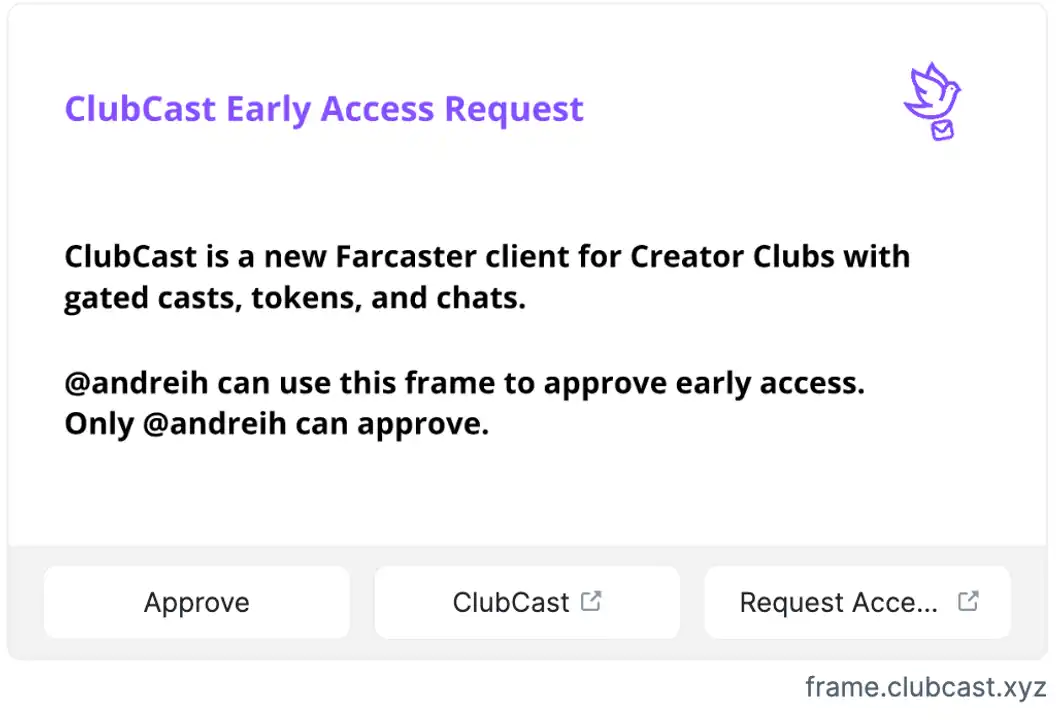 ClubCast 是一个 Farcaster 上类似于知识星球的应用,开启了 token-gated casts 功能,需要用户付费购买其他用户的 club token,才可在 clubcast.xyz 或者 Frame 里解锁查看隐藏内容,目前还需要开发者许可才能使用。