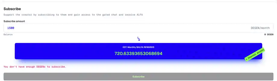 每天平台会产出$ALFA 代币,每个频道会根据订阅所得的$Degen 数量将分配到的$ALFA 均分给订阅用户。