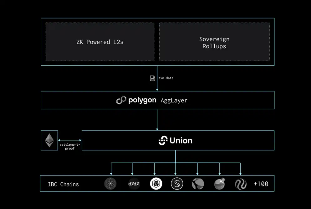 Union 是一个基于 Cosmos 构建的零知识基础设施层,该项目用于一般消息传递、资产转移、NFT 和 DeFi。它基于共识验证,不依赖于受信任的第三方、预言机、多重签名或 MPC。作为接入链,进入聚合层后实现了 EVM 与 Cosmos 的深度连接,因为只需将 Union 作为 IBC 网关即可实现连接 Union 再连接 IBC,从而使得两个彼此割裂的模块化生态重新组合在一起。